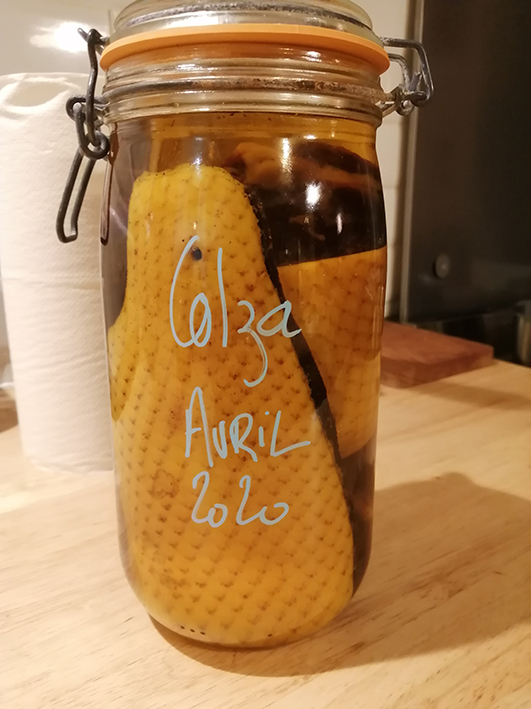 Alors pour ne pas perdre ce délicat et combien savoureux morceau, nous avons fait le choix de le conserver à l’huile. Huile de colza de la maison Fraisse à Villeneuve sur Vère.